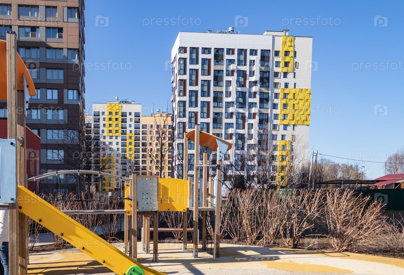 Детская площадка во дворе жилого массива в солнечный весенний день. Жилой комплекс «В лесу», Москва, Россия