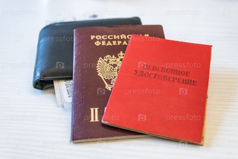 Кошелек, деньги, паспорт и пенсионное удостоверение лежат на столе. Русский перевод: пенсионное удостоверение