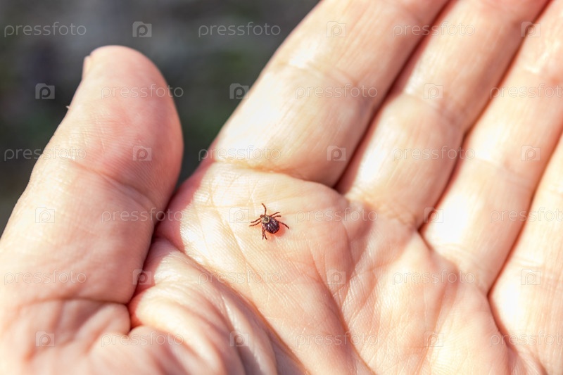 Клещ Ixodes ricinus ползет по коже человека. энцефалитический клеща. этот вид животных является носителем боррелия