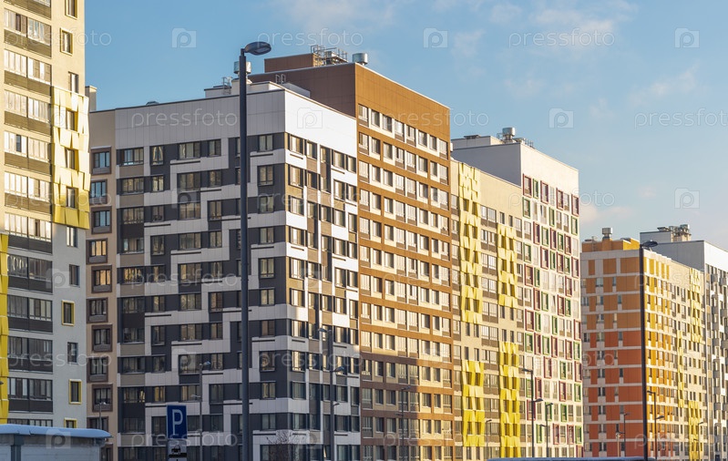 Современный многоквартирный дом с красочными фасадами на окраине города. Москва, Россия