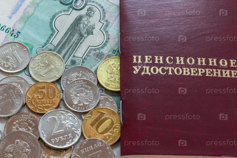 Пенсионное удостоверение личности и деньги на столе. Надпись на удостоверении: «пенсионное удостоверение»