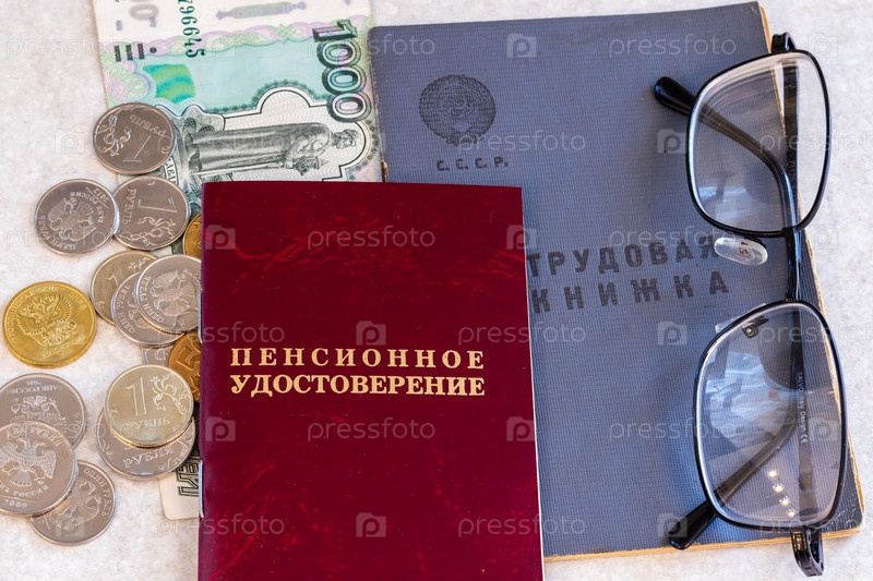 На столе трудовая книжка работника, пенсионное удостоверение, очки и деньги. Надписи в удостоверении: «Трудовая книжка», «Пенсионное удостоверение»