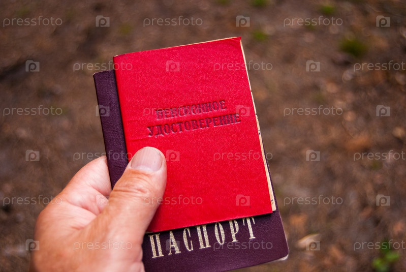 Рука лица, имеющего паспорт и пенсионное удостоверение-русский перевод: пенсионное удостоверение