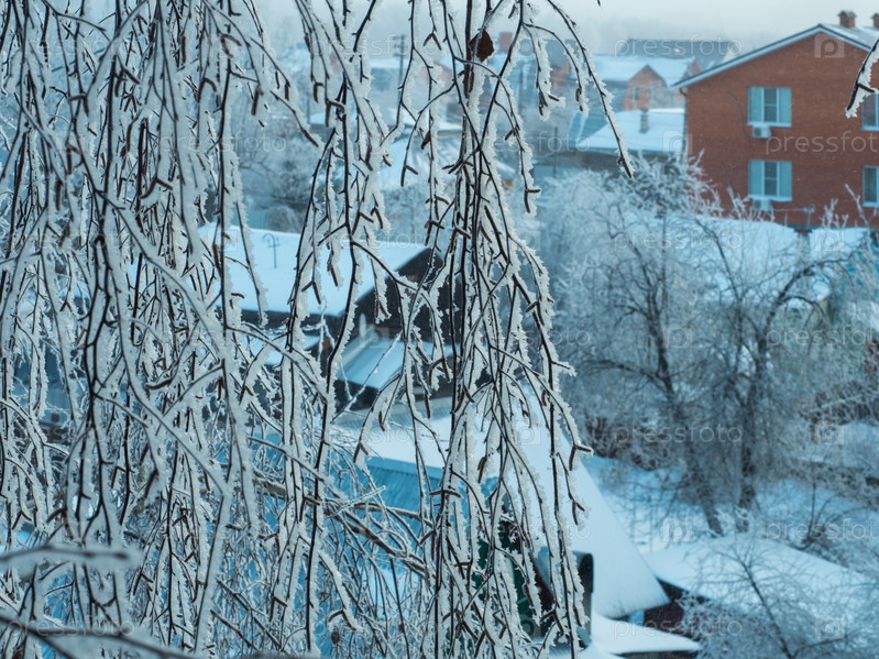 Ветки березы покрыты инеем