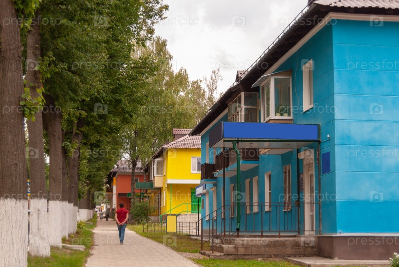 Город Суворов, Тульская область, Россия. Аккуратный двухэтажный дом в ярком цвете