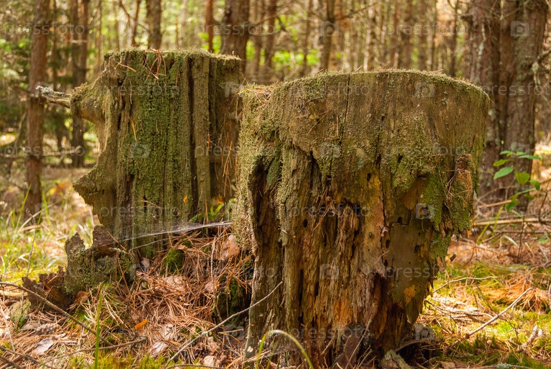 Очень старые гнилые разрушенные деревянные пни. Гнилые пни, мох, природный лес