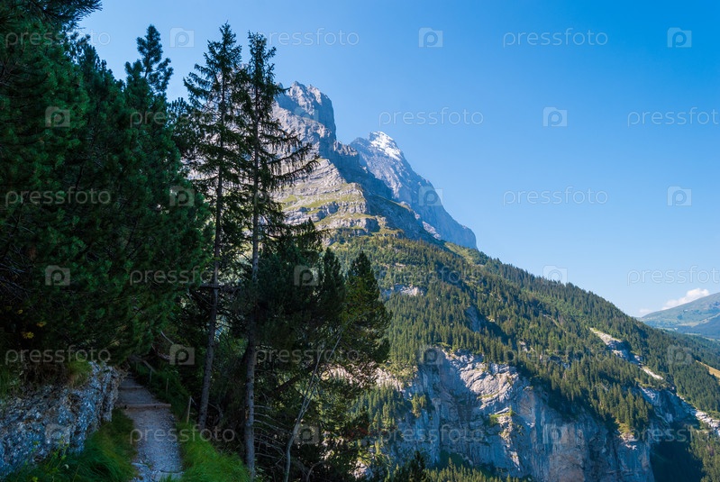 Походная тропа в швейцарских Альпах летом с видом на восточные склоны пика Эйгер