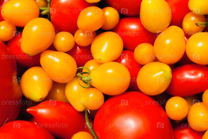 Сочетание красных и желтых спелых помидоров разного размера в качестве фона