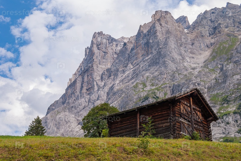 Красивый альпийский пейзаж с домом на вершине Веттерхорна, Гриндельвальд Швейцария Европа