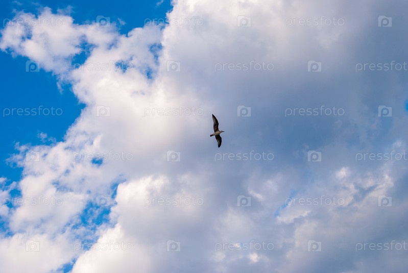 Красивые белые облака с голубым небом и чайкой, парящей в облаках