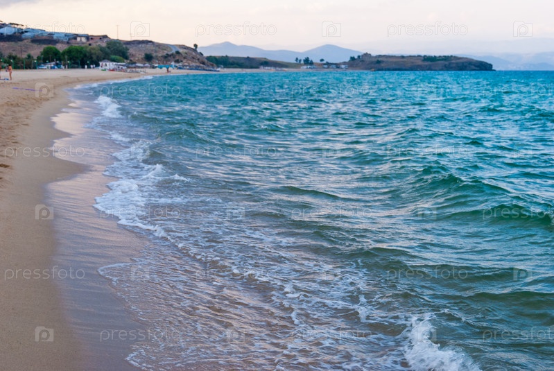 Морской прибой на песчаном пляже на побережье Греции