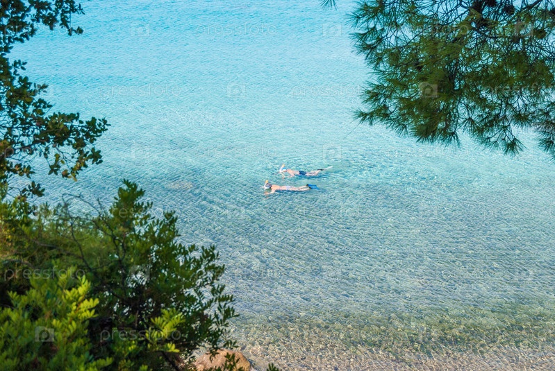 Солнечный красивый летний вид на песчаный пляж с греческим голубым морем с мелкой чистой водой и небольшими скалами. Халкидики Греция