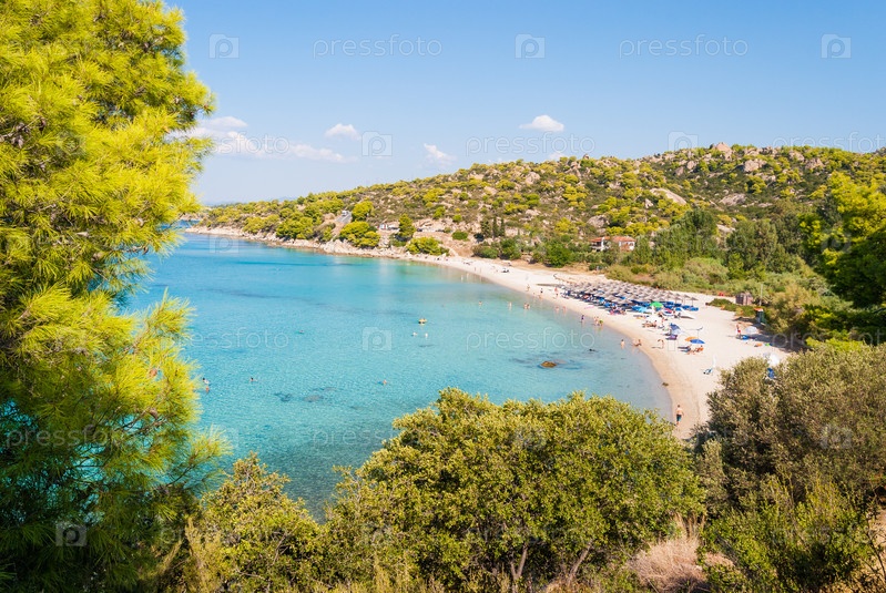 Солнечный красивый летний вид на песчаный пляж с греческим голубым морем с мелкой чистой водой и небольшими скалами. Халкидики Греция