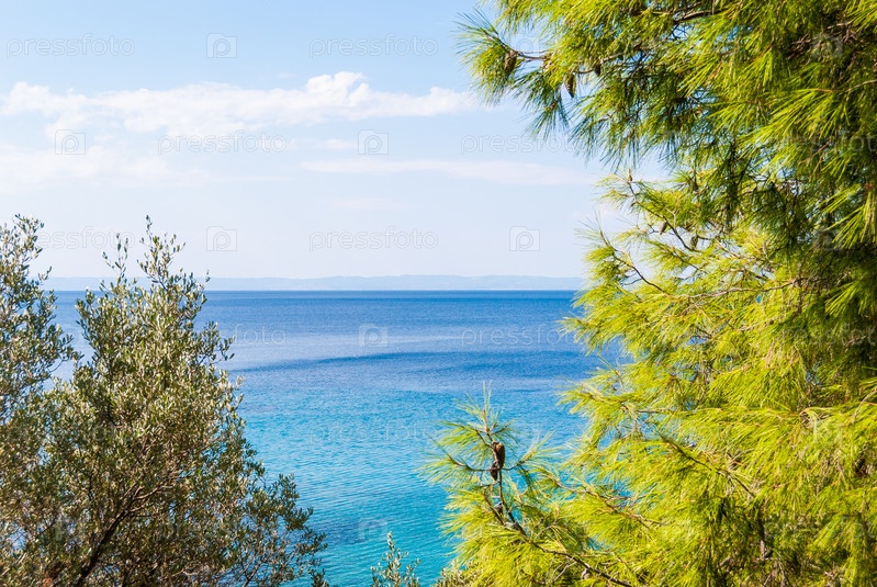 Солнечный красивый летний вид на песчаный пляж с греческим голубым морем с мелкой чистой водой и небольшими скалами. Халкидики Греция
