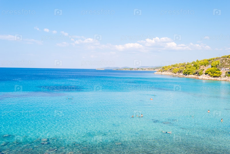 Солнечный красивый летний вид на песчаный пляж с греческим голубым морем с мелкой чистой водой и небольшими скалами. Халкидики Греция