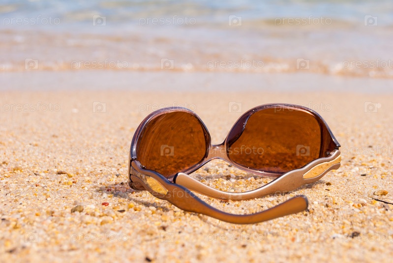 Солнцезащитные очки на пляже у моря против морской волны
