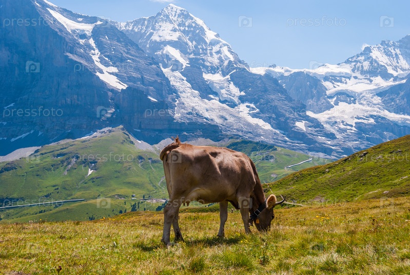 Корова на горном пастбище в швейцарских Альпах