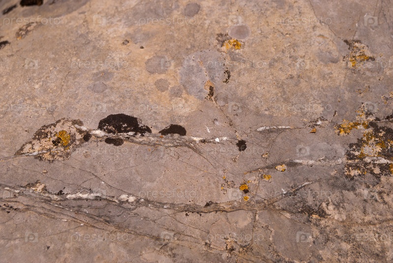 Гладкий природный камень с неповторимыми светлыми прожилками, трещинками, поросшими мхом и лишайником