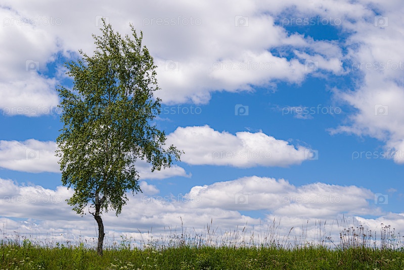 Одинокая береза на фоне голубого неба в весеннем пейзаже