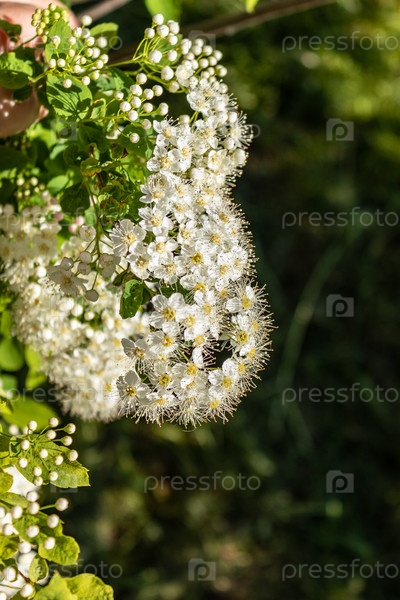 Белые цветы Spiraea vanhouttei в солнечный день с каплями росы. белая смазка