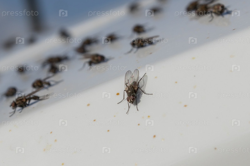 Мухи Musca domestica, сидящие на белой поверхности. в крупном плане
