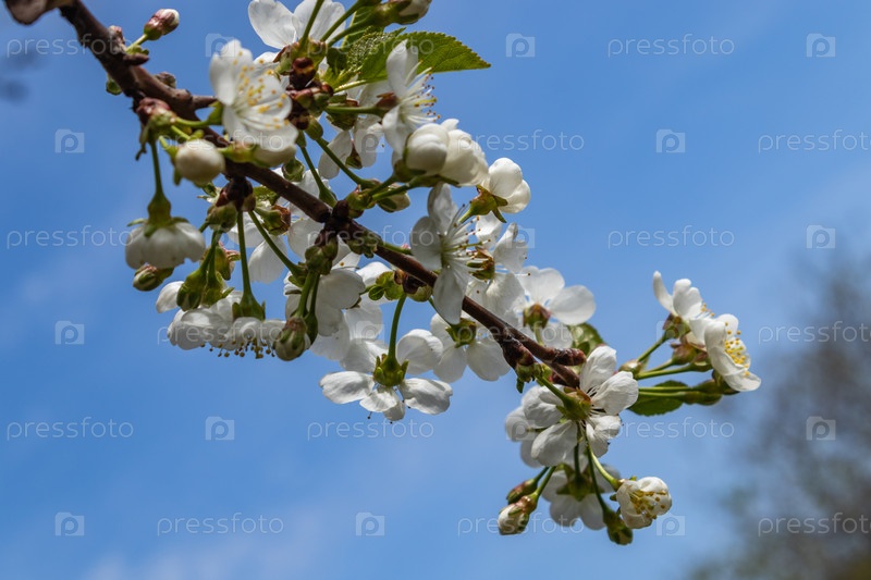 Белая вишня цветет весенним днем в саду. Прекрасный весенний день. крупным планом