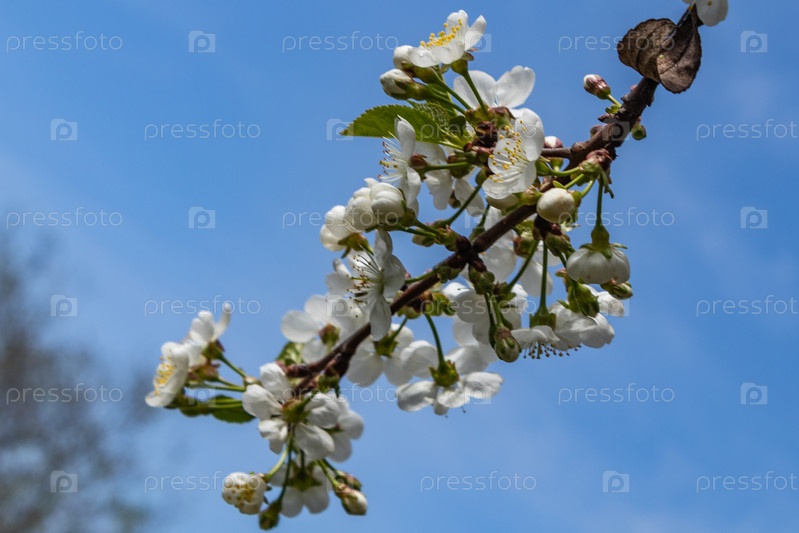Белая вишня цветет весенним днем в саду. Прекрасный весенний день. крупным планом