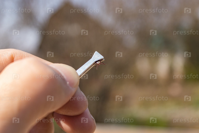 Клещ Ixodes ricinus захватывается металлическими щипцами на руке.Весенний энцефалит.Этот вид животных является переносчиком боррелии