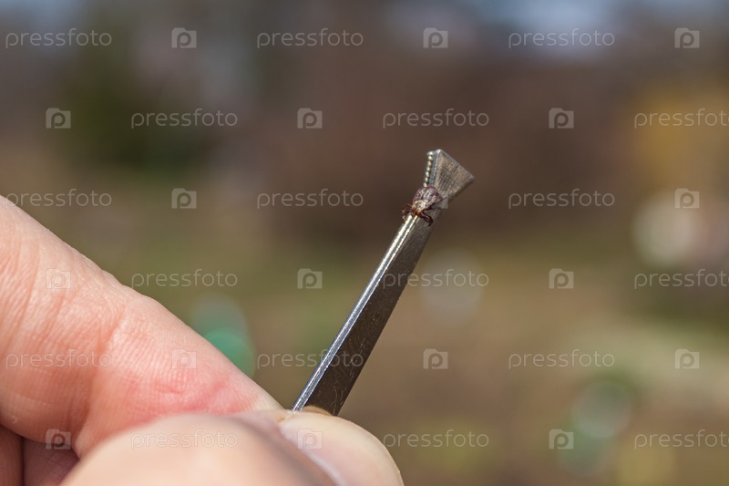 Клещ Ixodes ricinus захватывается металлическими щипцами на руке.Весенний энцефалит.Этот вид животных является переносчиком боррелии