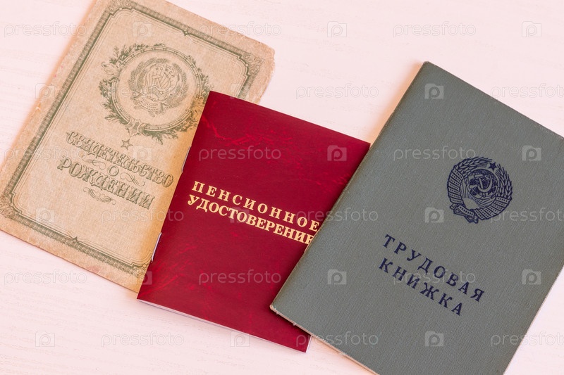 Трудовая книжка, пенсионное удостоверение, крупный план свидетельства о рождении