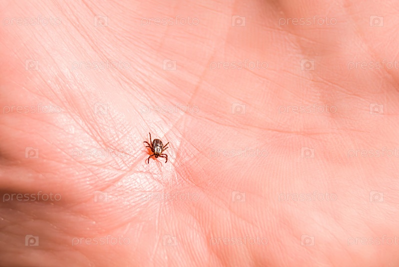 Клещ Ixodes ricinus ползет по коже человека. энцефалитический клеща. этот вид животных является носителем боррелия