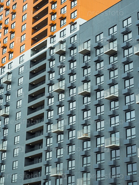 Яркий современный фасад дома с разнообразными окнами и балконами