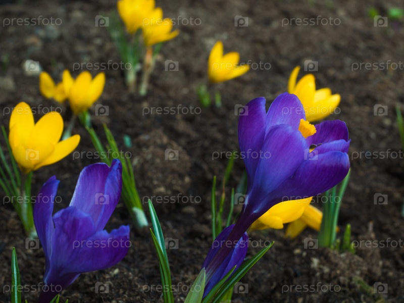 Небольшая поляна, на которой цвели разноцветные весенние крокусы