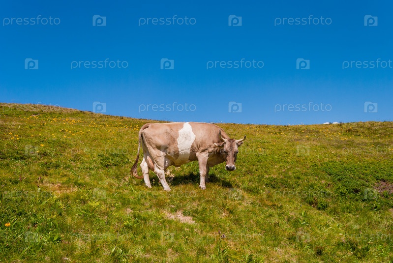 Корова на горном пастбище в швейцарских Альпах