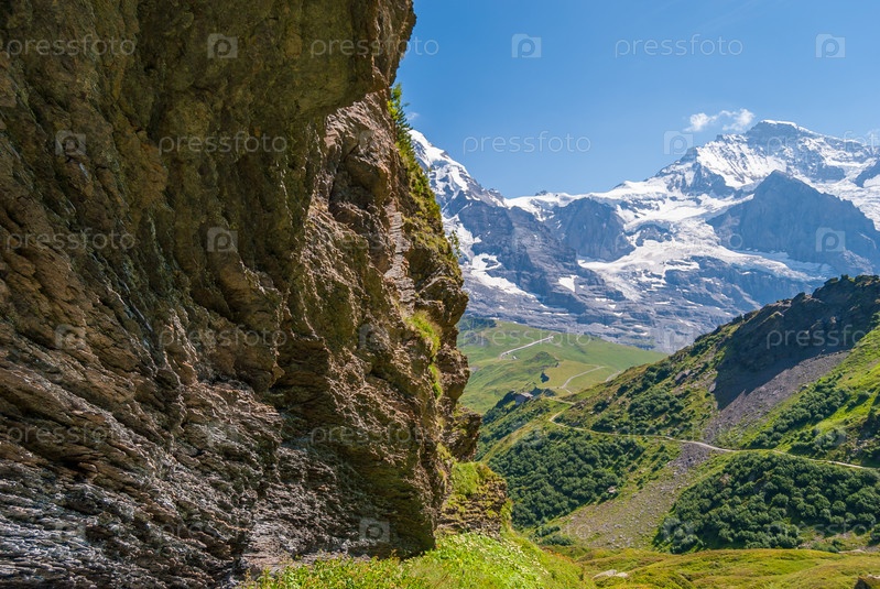 Походная тропа среди потрясающей альпийской панорамы пика Монк и Юнгфрау, Гриндельвальд, Бернские Альпы, Швейцария, Европа