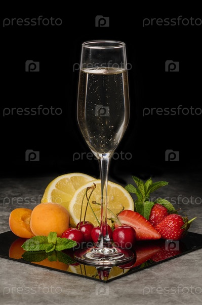 Бокал шампанского на черном фоне фрукты клубника апельсин мята