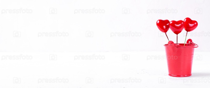 Декоративные сердца в маленьком красном ведерке на белом фоне. Широкий баннер. Валентинка