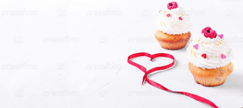 Капкейки со взбитыми сливками, посыпкой в форме сердца и малиной. Красная атласная лента, образующая сердце на белом столе. Десерт на День святого Валентина или свадьбу. Копировать пространство