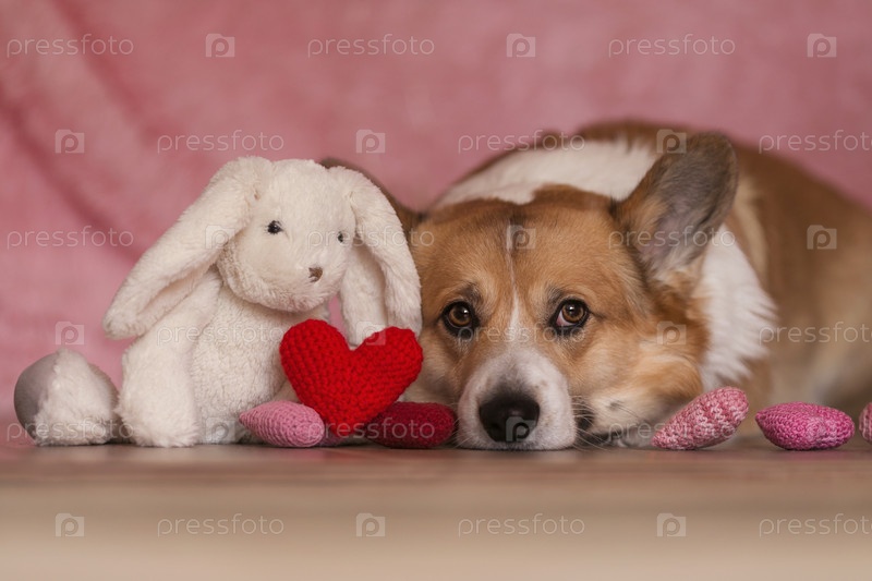 Портрет щенка корги с кроличьей игрушкой лежит на деревянном полу среди алых и розовых сердец