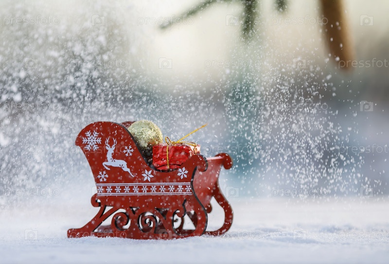 Праздничная открытка с рождественскими санями с подарками в лесу под снегопадом и еловой веткой