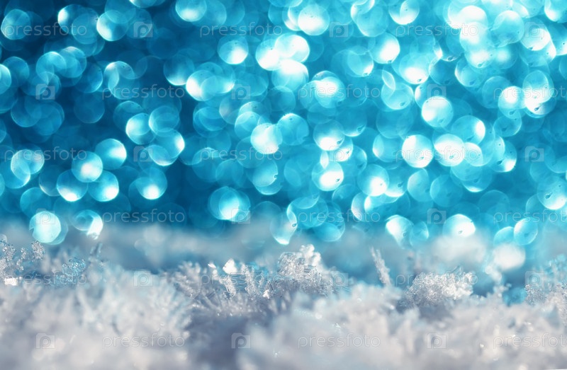 Праздничный фон с белыми кристаллами снега и блестящими голубыми искрами и кругами