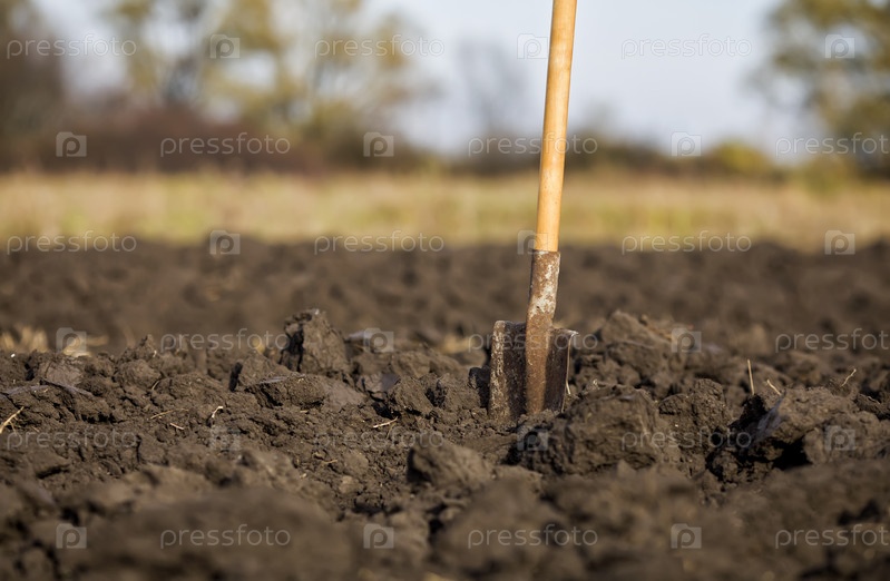Старая лопата стоит в разбитой земле во время сезонных осенних сельскохозяйственных работ