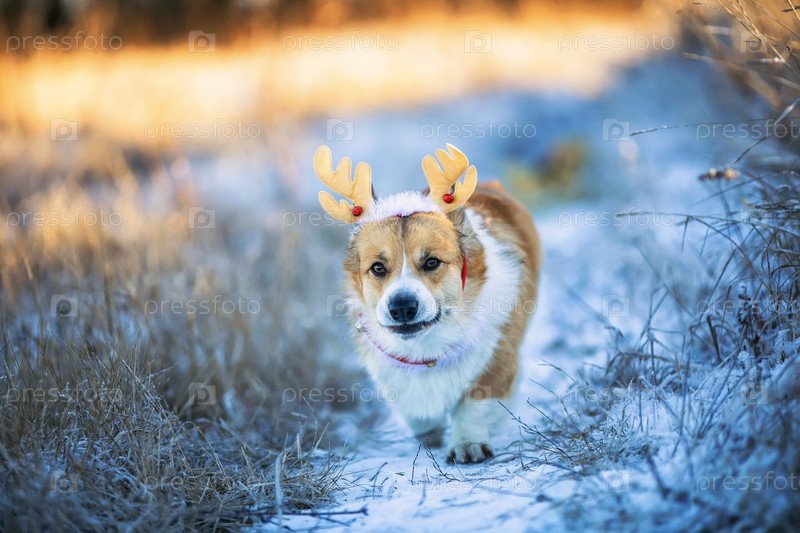 Праздничная открытка с милой собакой корги в рогах северного оленя, гуляющей в зимнем парке