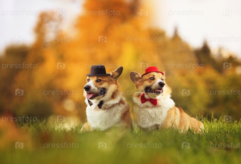 Две красивые собаки корги в джентльменских шляпах и галстуках сидят в осеннем солнечном парке