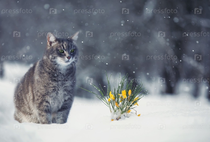 Красивая кошка гуляет в саду под снегом рядом с желтыми цветами крокуса ранней весной