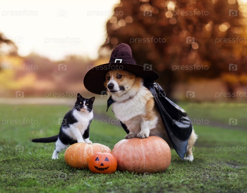 Милые забавные друзья собака корги в черной карнавальной кепке и плаще и кот, сидящий на оранжевых тыквах на Хэллоуин в осеннем солнечном саду