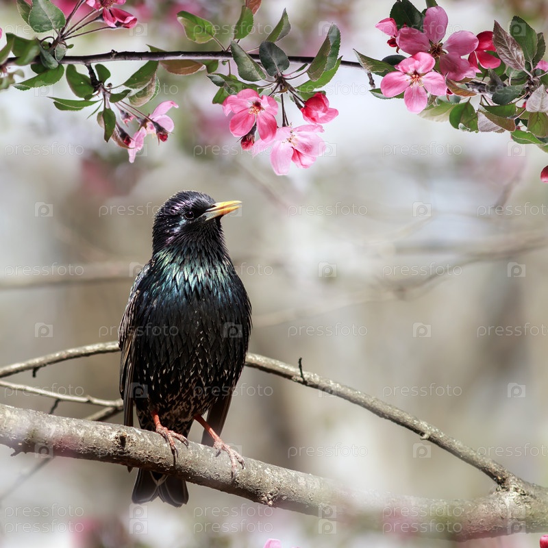 Черный скворец сидит в весеннем саду среди цветущих ветвей яблони
