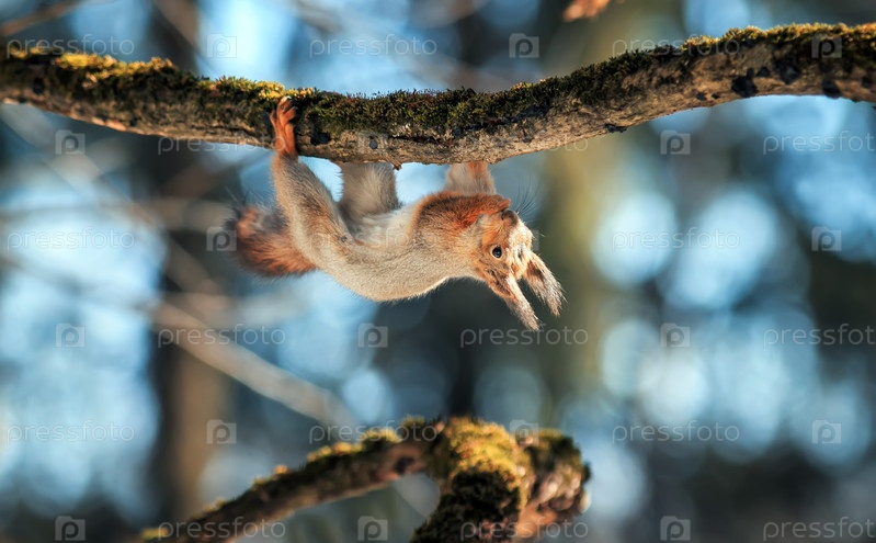 Милая пушистая белка висит на стволе дерева в парке до торма