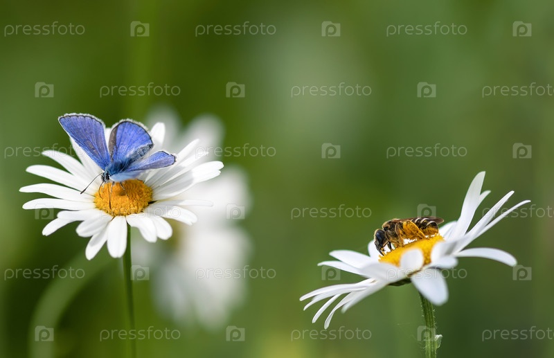 Естественный фон с бабочкой и пчелой, сидящей на цветках ромашки на летнем солнечном зеленом лугу