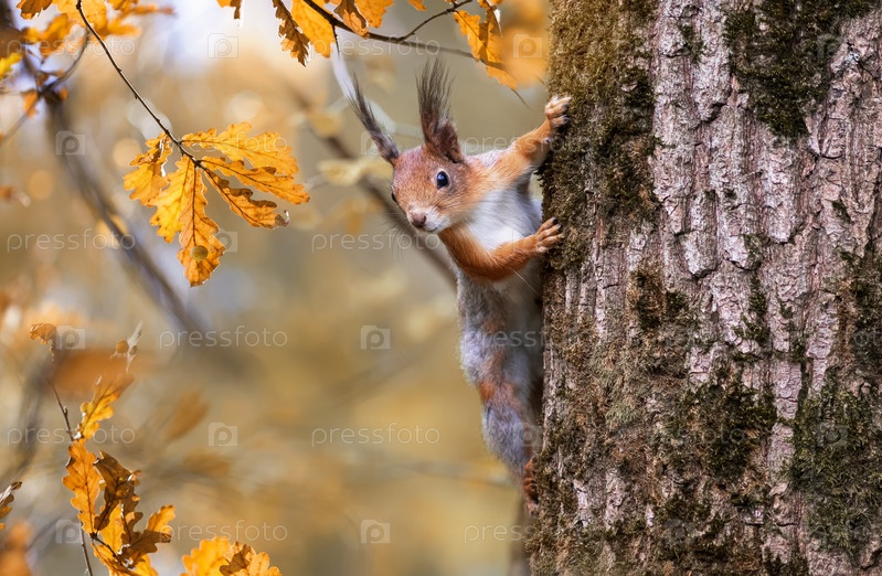 Милое пушистое животное-белка сидит на стволе дерева в осеннем солнечном парке с золотыми листьями